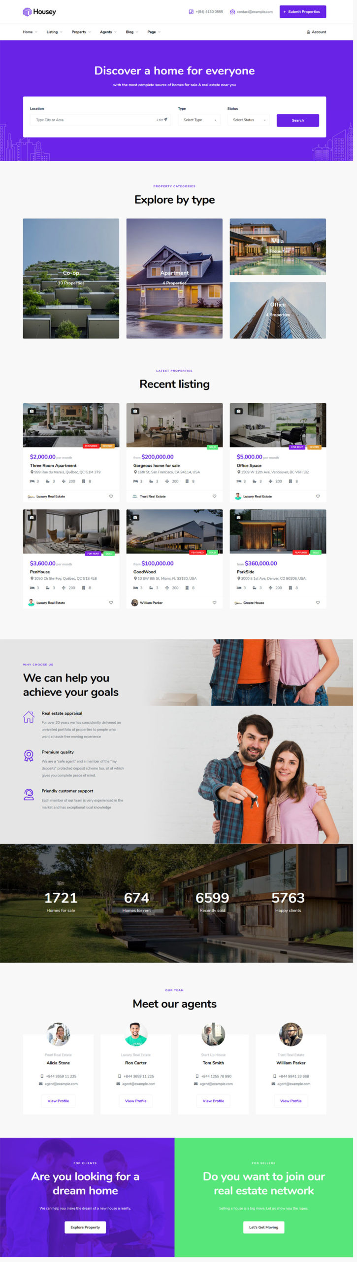 Housey real estate WordPress theme is designed for showcasing real estate and new property development. It is completely suitable for Renting or Selling your Apartment, House, Villa, Farm House, and Raw House. The premium theme has a bold and modern design with a full-screen homepage image and single-page website layout (but can also be used for a full website).