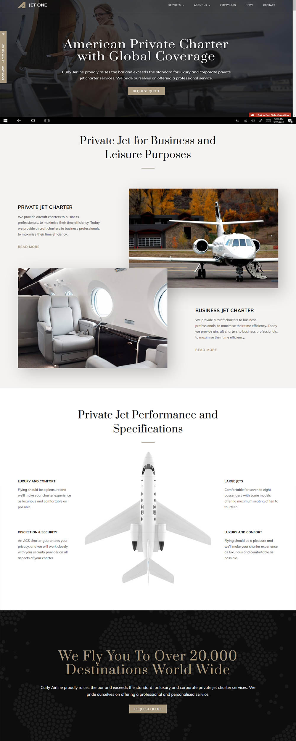 Jet One WP is a premium WordPress theme for private airlines. Its unique features and functionalities make it the ideal solution for websites dedicated to private flights, aircrafts, charters or any other businesses related to private airlines. The theme is well suited for all types of flight services: private jet, regional airliner, long range jet, small prop, aircraft spotlight, private helicopter, charter air ambulance or air taxi.